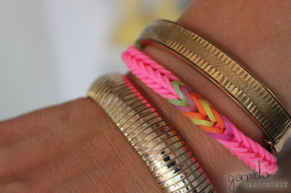 Hier ist seit 2 Wochen das Loomie Fieber ausgebrochen. Ich bekomme ein Armband nach der anderen geschenkt. Besonders zum Muttertag, danach und später immer noch ;-))) Ich nehme sie schon für die Butterbrotsdosen, da wo die Deckeln nicht mehr so richtig schließen. Sieht sehr dekorativ aus und es erinnert mich an früher, was wir mit Haushaltsgummis alles so angestellt haben: Gummitwist, Springspiele, Armbänder, … Hier ein paar Bilder. Übrigens zum klassischen Look mit Gold passt es auch sehr hervorragend!