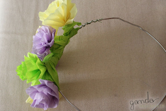 Eine Blume binden, dann mit einem schmalen Band Krepp-Papier umwickeln, wieder eine Blume binden, dann wieder weiter mit dem Papier wickeln …