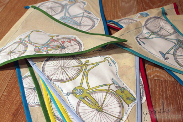 Jedes Kind hat für die Tour eine Wimpel zur Erinnerung bekommen. Ich hatte in einem Stoffladen ein schönes Motiv mit Fahrrädern entdeckt, diese Motive habe ich ausgeschnitten, auf die zugeschnittenen Wimpeln appliziert und diese dann mit Schrägband verschönert. Die Kinder haben dann passende Kordeln gedreht. Auf den Wimpeln haben wir dann „Tour 2014“ gestempelt (habe hier leider kein Foto).