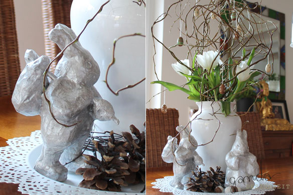 Einfach alte bunte Pappmaché Hasen in Silber färben, Glitzersteine als Augen kleben, fertig ist der Dekohase! Einfach zeitlos, diese Osterhasen dekoriere ich schon seit Jahren immer wieder zu Ostern und ich muss sie bis jetzt noch nicht umgestalten.
