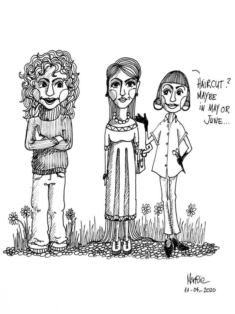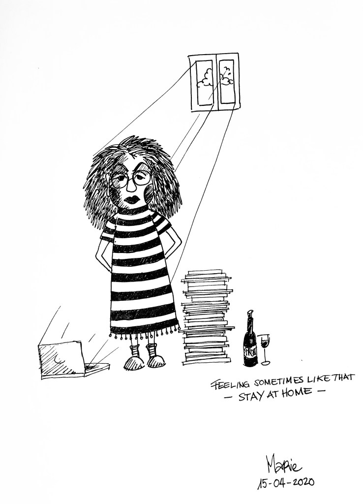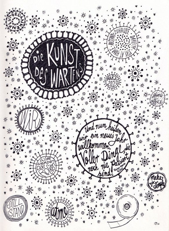Das Bild habe ich letzten Sonntag gezeichnet, da waren wir schon eine Woche alle zusammen im Homeoffice. Jetzt sind schon zwei Wochen um. Viele Spaziergänge zwischendurch, Gartenarbeit (das Wetter ist einfach ideal), keine Fahrerei, keine Termine nach der anderen, kein Sport, kein Tanzen, keine Verabredungen. Ich bin entspannt, aber es ist eine komische Zeit und ungewiß. Es ist ruhig im Haus, wenn wir arbeiten und die Kinder ihre Schularbeiten machen … viel los wenn wir alle Feierabend haben. Routine, Hausarbeiten, Lesen, Kontakte über Facetime, WhatsApp, Skype & Co. pflegen, Bewegung, viele Dinge gemeinsam oder alleine machen und noch vieles mehr helfen den Tag zu gestalten. Ich gebe zu, ich geniesse auch diesen Umstand zu Hause zu sein. Ab und zu sind wir auch genervt voneinander, aber zum Glück legt sich das sehr schnell und Kompromisse werden gemacht. Was für eine Zeit … und für andere eine schwere ungewisse Zeit. Vielleicht auch für uns, Familie und Freunde? … Es sind noch Wochen vor uns … Was uns noch alles blüht in dieser Lage?