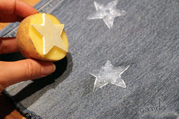 Textilfarbe habe ich geholt, Weiß mit Glitzer!!! Ein Kartoffelstempel in Sternform habe ich geschnitzt, die Hose geschnitten und einfach losgelegt … gestempelt, gestempelt und gestempelt. Es hat ein Riesenspaß gemacht, ich überlege gerade ob ich gerne eine Hose von mir auch „opfern“ sollte … hier das Ergebnis: