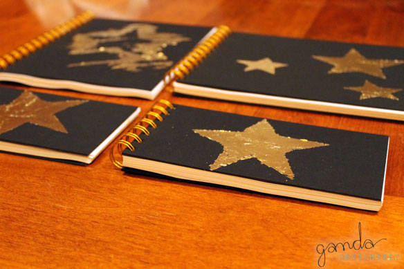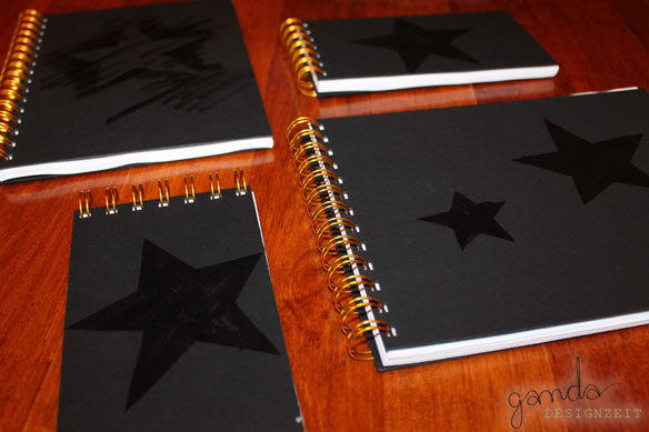 Ich habe mich an Notizbücher herangewagt, auch Skizzenbücher genannt. Wegen Datenänderungen sind stapelweise Briefbögen aus unserer Agentur unbrauchbar geworden. Zu Schade zum wegschmeißen! Das Papier hat eine gute Struktur und ist ideal für Skizzen und Zeichnungen. Zum Teil habe ich diese neu liniert und mit Kalender versehen. Der andere Teil sind einfach leere Blätter. Die Bücher habe ich mit goldener Spiralbindung versehen, die Deckblätter sind aus schwarzem Karton (Verschnitt von unseren Präsentationspappen). Da es nicht so langweilig aussehen soll und bald Weihnachten ist, habe ich diese sogar mit Sternen vergoldet 😉